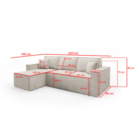 Sedací souprava je univerzální, sami si zvolíte při montáží, zda chcete mít roh vlevo nebo vpravo.
