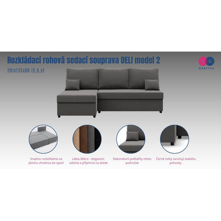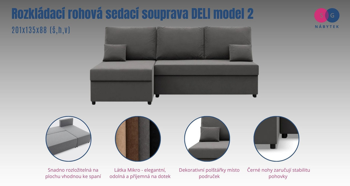 Pevná konstrukce ze dřeva a OSB desky. Potah z kvalitní látky Micro v mnoha moderních barevných odstínech. Snadné rozkládání pohovky na lůžkovou podobu. Moderní design vhodný do všech současných interiérů.