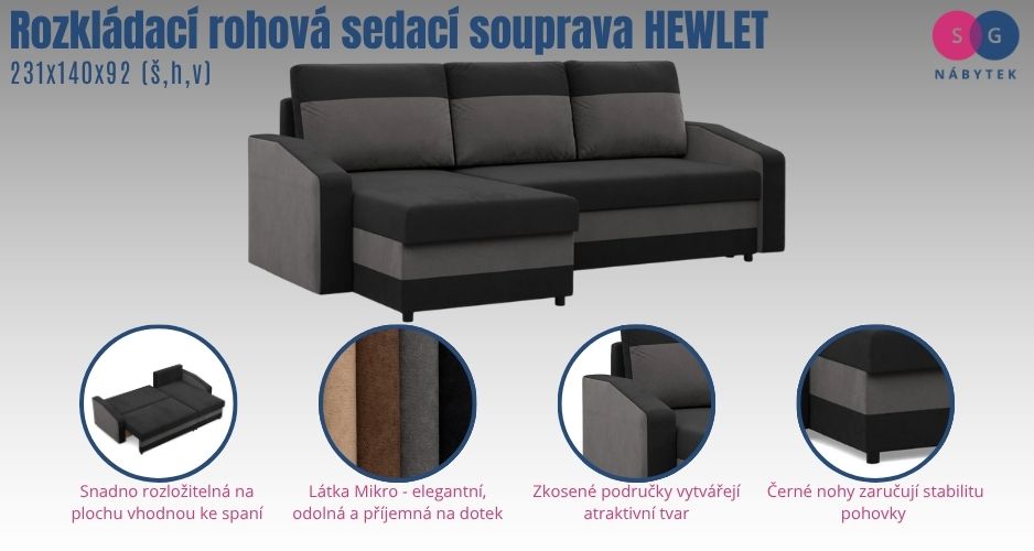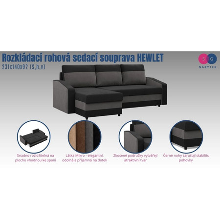 Sedací souprava Hewlet je moderní a stylový kus nábytku, který byl navržen s ohledem na lidi kteří oceňují pohodlí a funkčnost. Je vyrobena z pevných, vysoce kvalitních materiálů. Nohy jsou vyrobeny z plastu.