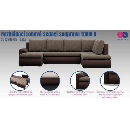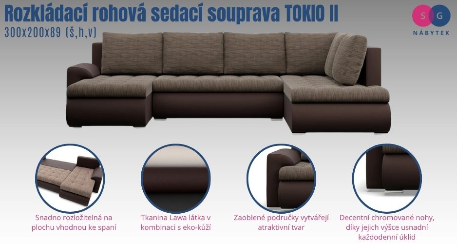 Pevná konstrukce ze dřeva a OSB desky. Potah z kvalitní tkaniny v mnoha moderních barevných odstínech. Sedací část je prošívaná. Snadné rozkládání sedací soupravy na lůžkovou podobu. Moderní design vhodný do všech současných interiérů.