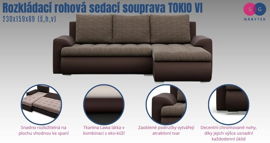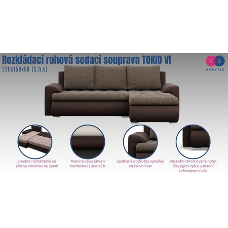 Pevná konstrukce ze dřeva a OSB desky. Potah z kvalitní tkaniny v mnoha moderních barevných odstínech. Sedací část je prošívaná. Snadné rozkládání sedací soupravy na lůžkovou podobu. Moderní design vhodný do všech současných interiérů.