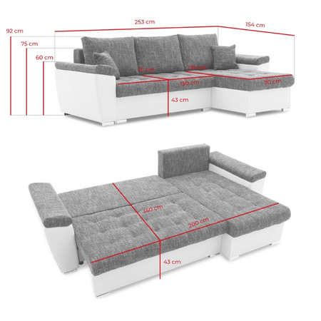 Pevná konstrukce ze dřeva a OSB desky. Potah z kvalitní eko-kůže a tkaniny v mnoha moderních barevných odstínech. Snadné rozkládání pohovky na lůžkovou podobu. Moderní design vhodný do všech současných interiérů. Prošívaný podsedák.