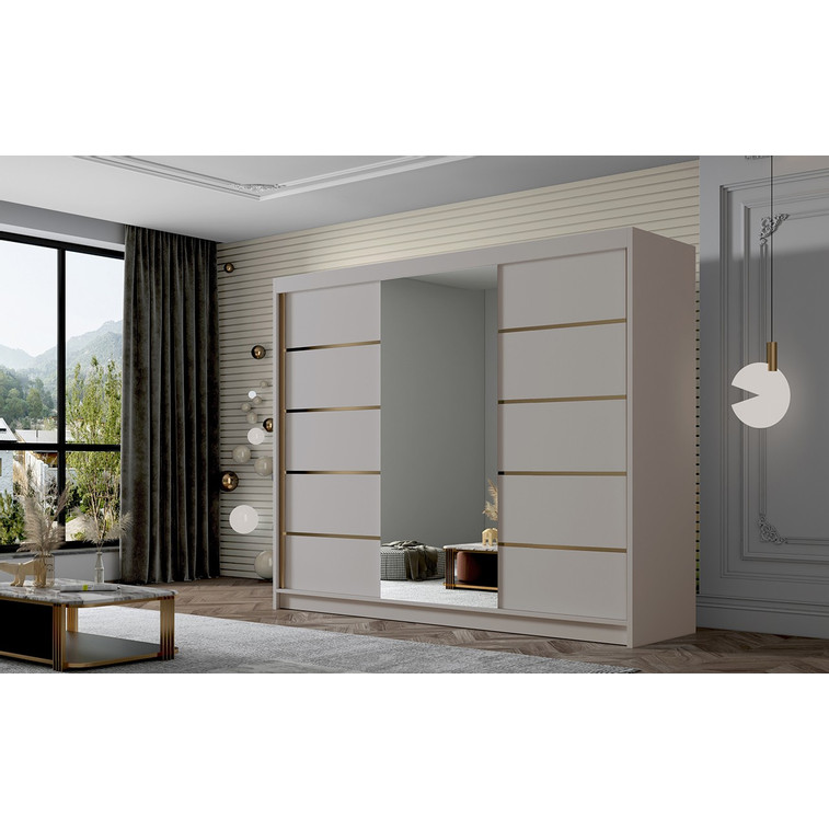 Posuvná šatní skříň Amber VI kombinuje klasickou jednoduchost a moderní design. Zrcadlo umístěné na dveřích dodává své jedinečné kouzlo. Je ideální jako šatní skříň do předsíně nebo místo pro uložení oblečení v ložnici nebo jiných drobností každodenní potřeby.