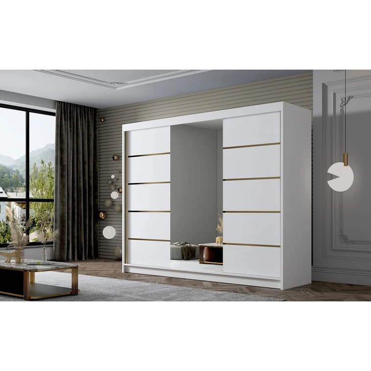 Posuvná šatní skříň Amber VI kombinuje klasickou jednoduchost a moderní design. Zrcadlo umístěné na dveřích dodává své jedinečné kouzlo. Je ideální jako šatní skříň do předsíně nebo místo pro uložení oblečení v ložnici nebo jiných drobností každodenní potřeby.