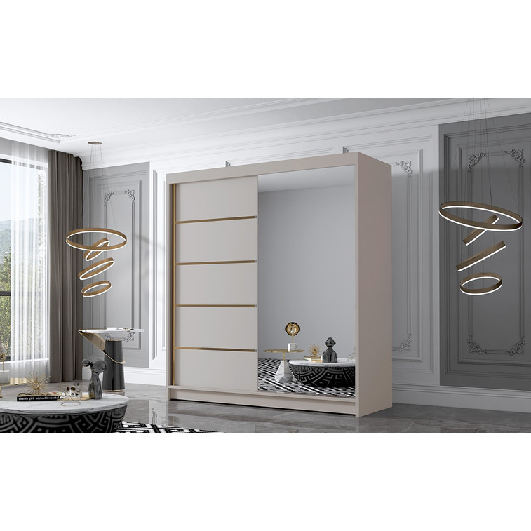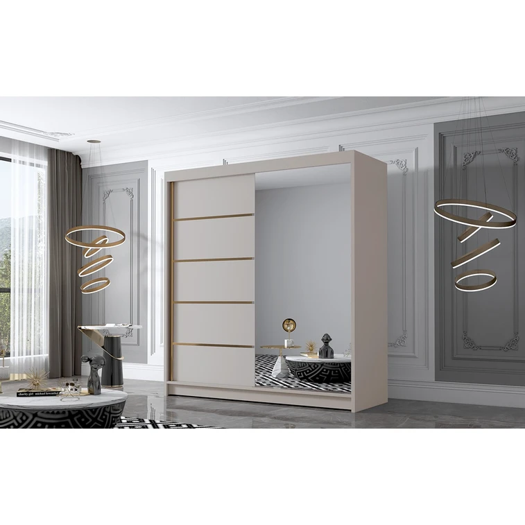 Posuvná šatní skříň Bali III kombinuje klasickou jednoduchost a moderní design. Zrcadlo umístěné na dveřích dodává své jedinečné kouzlo. Je ideální jako šatní skříň do předsíně nebo místo pro uložení oblečení v ložnici nebo jiných drobností každodenní potřeby. Šatní skříň je rozdělena na dvě stejné části. Na jedné straně jsou police a na druhé straně je závěsná šatní tyč.