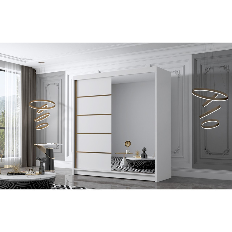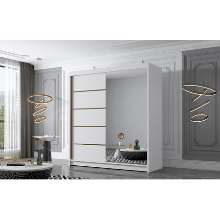 Posuvná šatní skříň Bali III kombinuje klasickou jednoduchost a moderní design. Zrcadlo umístěné na dveřích dodává své jedinečné kouzlo. Je ideální jako šatní skříň do předsíně nebo místo pro uložení oblečení v ložnici nebo jiných drobností každodenní potřeby. Šatní skříň je rozdělena na dvě stejné části. Na jedné straně jsou police a na druhé straně je závěsná šatní tyč.