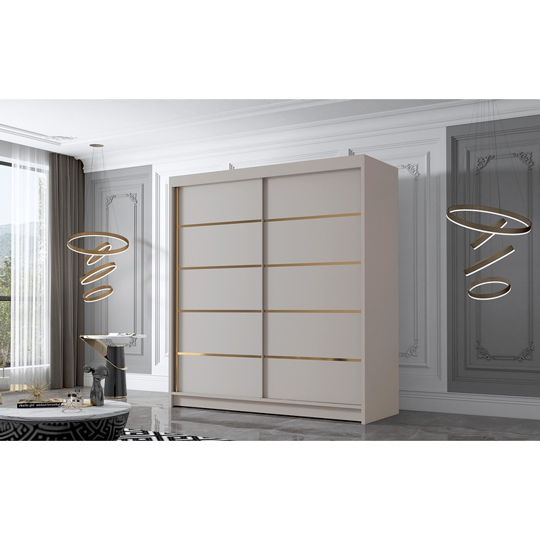 Posuvná šatní skříň Bali IV kombinuje klasickou jednoduchost a moderní design. Je ideální jako šatní skříň do předsíně nebo místo pro uložení oblečení v ložnici nebo jiných drobností každodenní potřeby. Šatní skříň je rozdělena na dvě stejné části. Na jedné straně jsou police a na druhé straně je závěsná šatní tyč.
