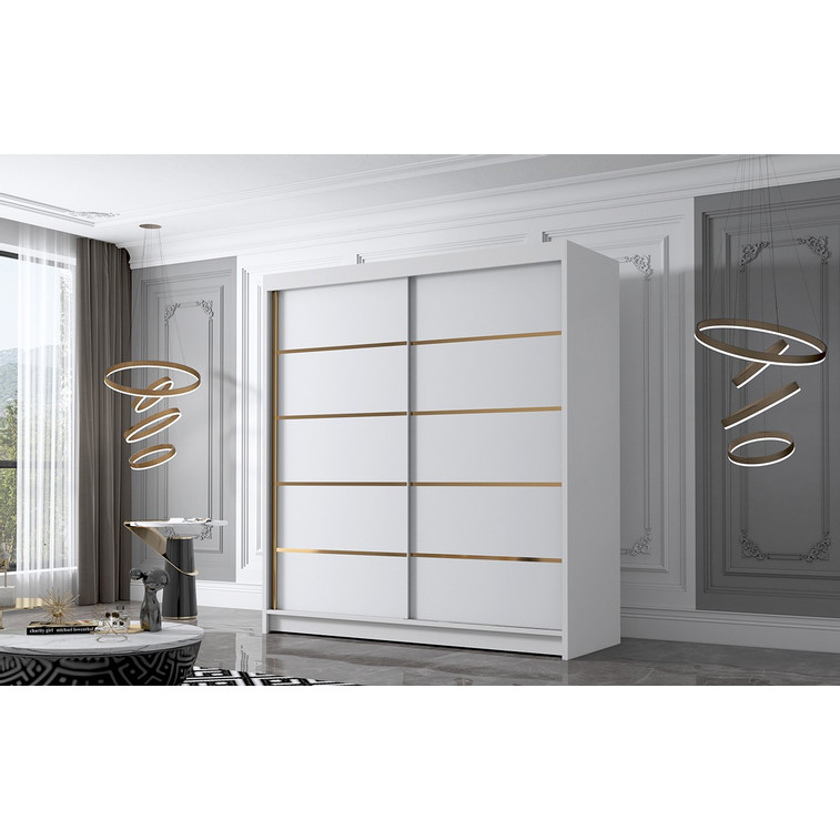 Posuvná šatní skříň Bali IV kombinuje klasickou jednoduchost a moderní design. Je ideální jako šatní skříň do předsíně nebo místo pro uložení oblečení v ložnici nebo jiných drobností každodenní potřeby. Šatní skříň je rozdělena na dvě stejné části. Na jedné straně jsou police a na druhé straně je závěsná šatní tyč.