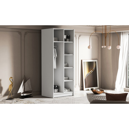 Šatní skříň kombinuje klasickou jednoduchost a moderní design. Je ideální jako šatní skříň do předsíně nebo místo pro uložení oblečení v ložnici nebo jiných drobností každodenní potřeby. Šatní skříně je rozdělena na dvě stejné části. Na jedné straně jsou police a na druhé straně je závěsná šatní tyč.