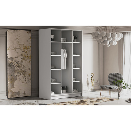 Šatní skříň kombinuje klasickou jednoduchost a moderní design. Je ideální jako šatní skříň do předsíně nebo místo pro uložení oblečení v ložnici nebo jiných drobností každodenní potřeby. Šatní skříně je rozdělena na tři části. Po stranách jsou police a uprostřed je závěsná šatní tyč.