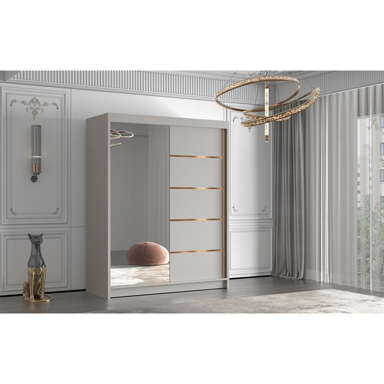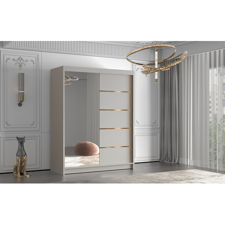 Posuvná šatní skříň Flavio III kombinuje klasickou jednoduchost a moderní design. Zrcadlo umístěné na dveřích dodává své jedinečné kouzlo. Je ideální jako šatní skříň do předsíně nebo místo pro uložení oblečení v ložnici nebo jiných drobností každodenní potřeby. Šatní skříň je rozdělena na dvě stejné části. Na jedné straně jsou police a na druhé straně je závěsná šatní tyč.