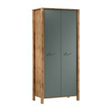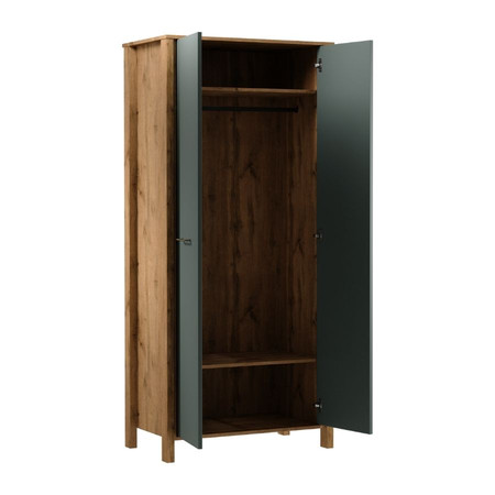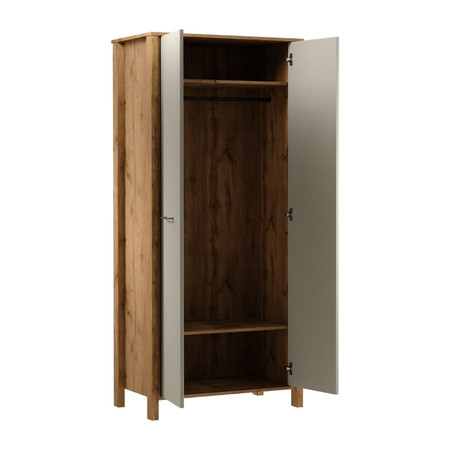Šatní skříň s tyčí na zavěšení oblečení a s 2 praktickými policemi. Matně zlaté rukojeti dodávají eleganci. Přírodní barvy teplého dekoru dub Wotan na korpusu nábytku v kombinaci s jednobarevnou béžovou nebo zelenou na výběr dělají kolekci přirozeně krásnou.