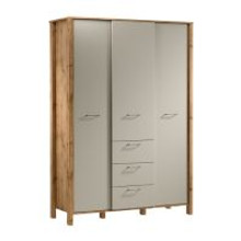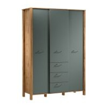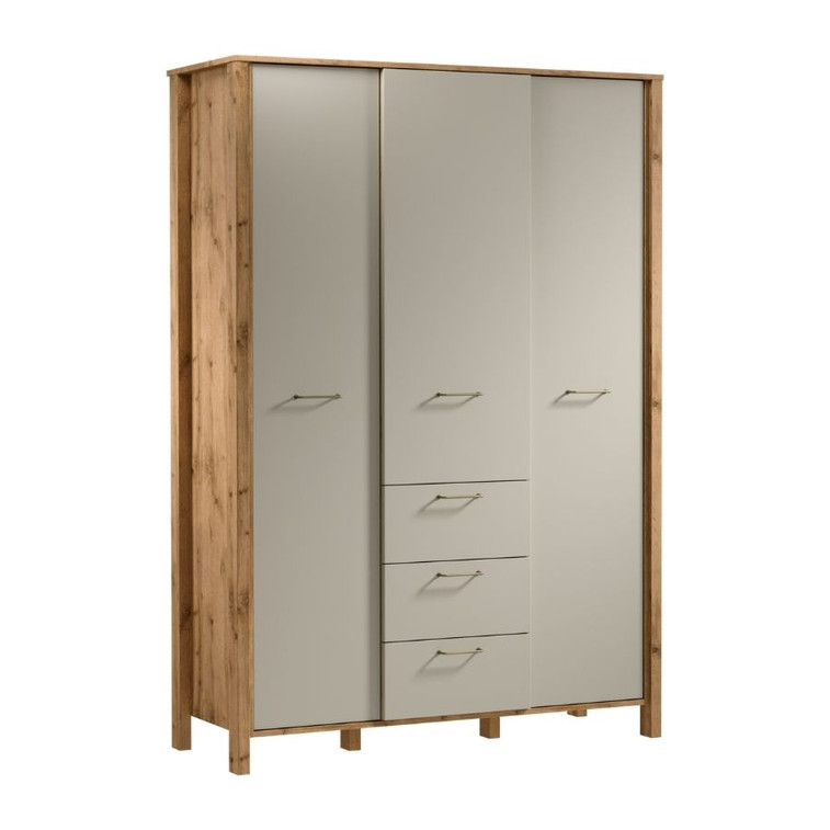 Šatní skříň S3D3S se skvěle hodí k uložení oblečení. Zásuvky mají funkci plného výsuvu, což výrazně usnadňuje přístup k předmětům uvnitř. V bočních částech šatní skříně jsou tyče na zavěšení oblečení a uprostřed jsou police. Matně zlaté rukojeti dodávají eleganci. Přírodní barvy teplého dekoru dub Wotan na korpusu nábytku v kombinaci s jednobarevnou béžovou nebo zelenou na výběr dělají kolekci přirozeně krásnou.