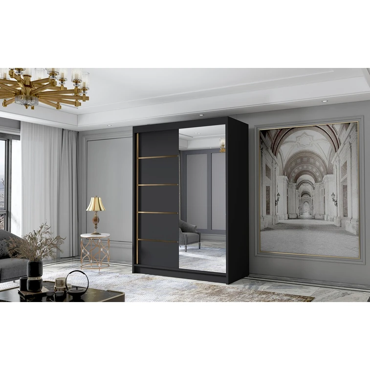 Posuvná šatní skříň Lungo III kombinuje klasickou jednoduchost a moderní design. Zrcadlo umístěné na dveřích dodává své jedinečné kouzlo. Je ideální jako šatní skříň do předsíně nebo místo pro uložení oblečení v ložnici nebo jiných drobností každodenní potřeby. Šatní skříň je rozdělena na dvě stejné části. Na jedné straně jsou police a na druhé straně je závěsná šatní tyč.
