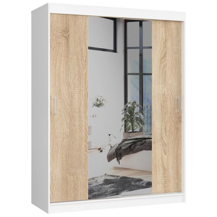 Šatní skříň posuvná 150cm CLP se zrcadlem bílá/dub sonoma