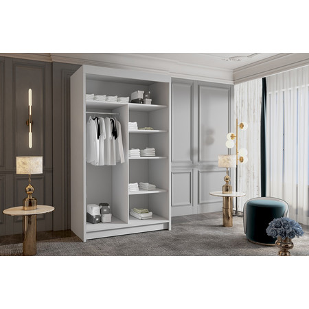 Posuvná šatní skříň Vigo III kombinuje klasickou jednoduchost a moderní design. Zrcadlo umístěné na dveřích dodává své jedinečné kouzlo. Je ideální jako šatní skříň do předsíně nebo místo pro uložení oblečení v ložnici nebo jiných drobností každodenní potřeby. Šatní skříň je rozdělena na dvě stejné části. Na jedné straně jsou police a na druhé straně je závěsná šatní tyč.
