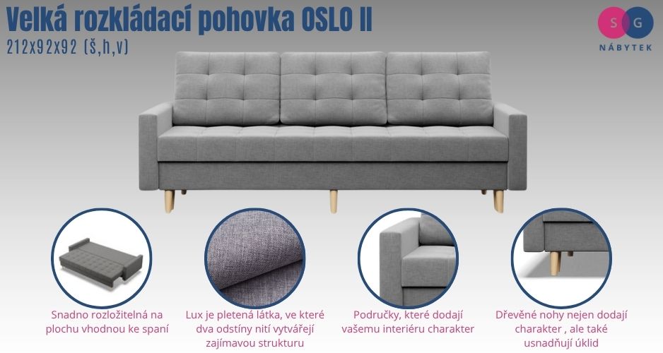 Pevná konstrukce ze dřeva a OSB desky. Snadné rozkládání pohovky na lůžkovou podobu. Moderní skandinávský design vhodný do všech současných interiérů.