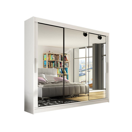 Velká a prostorná šatní skříň Aston III se systémem posuvných dveří. Vyrobena z nejkvalitnějších materiálů. Vodicí systém v něm použitý značně usnadňuje proces otevírání a zavírání šatní skříně. Interiér nábytku je navržen tak, aby v něm bylo místo nejen pro oblečení, ale i jiné drobné osobní předměty. Ideální do ložnice, obývacího pokoje nebo větší haly. Další předností šatní skříně je nádherné velké zrcadlo.