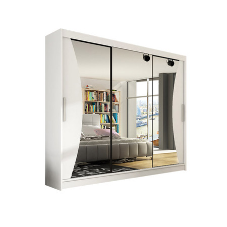 Velká a prostorná šatní skříň Aston IV se systémem posuvných dveří. Vyrobena z nejkvalitnějších materiálů. Vodicí systém značně usnadňuje proces otevírání a zavírání šatní skříně. Interiér nábytku je navržen tak, aby v něm bylo místo nejen pro oblečení, ale i jiné drobné osobní předměty. Ideální do ložnice, obývacího pokoje nebo větší haly. Další předností šatní skříně je nádherné velké zrcadlo pokrývající téměř celou plochu skříně.