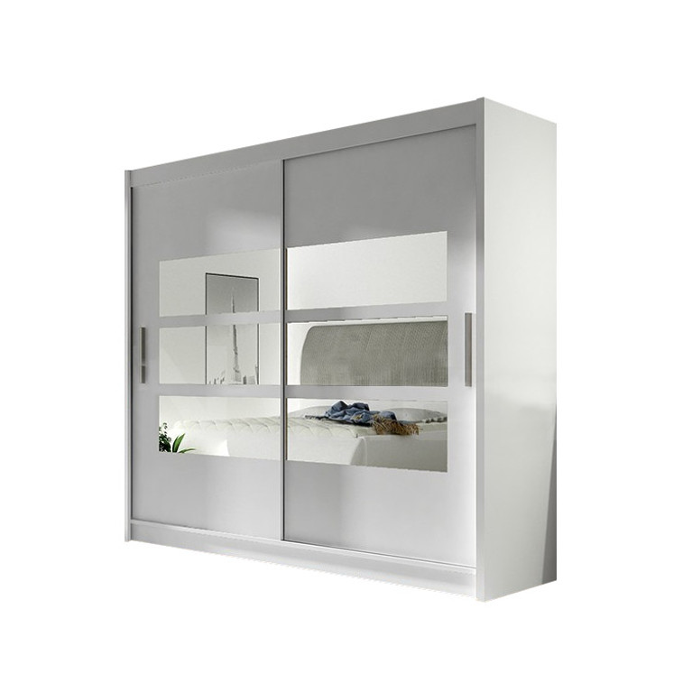Praktická šatní skříň se systémem posuvných dveří. Ideální pro uložení oblečení. Moderní uspořádání zrcadel dělá z nábytku dekorativní prvek interiéru. Je vyrobena z vysoce kvalitní laminované desky.