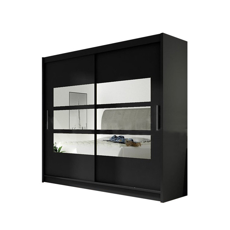 Praktická šatní skříň se systémem posuvných dveří. Ideální pro uložení oblečení. Moderní uspořádání zrcadel dělá z nábytku dekorativní prvek interiéru. Je vyrobena z vysoce kvalitní laminované desky.