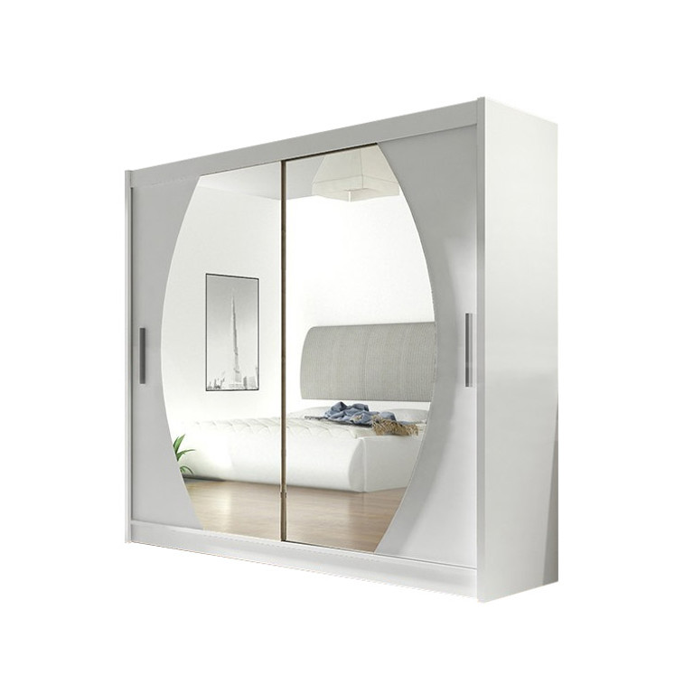 Dvoudveřová šatní skříň se systémem posuvných dveří, která usnadňuje každodenní používání. Moderní, funkční a elegantní. Určeno pro bezpečné uložení oděvů a jiných osobních věcí. Vyznačuje se velkými zajímavými zrcadly na dveřích, která opticky zvětší a prosvětlí každou místnost.