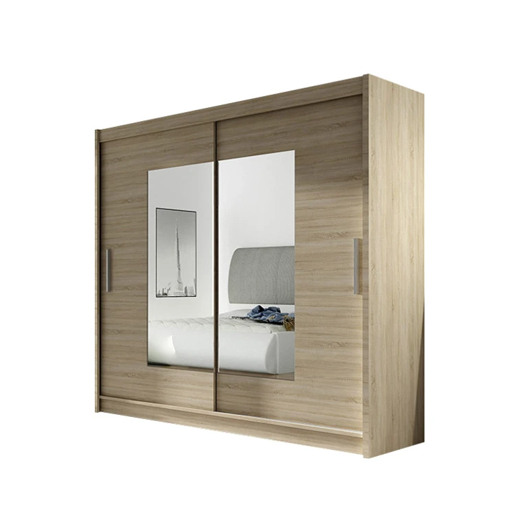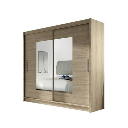 Dvoudveřová šatní skříň se systémem posuvných dveří pro každodenní použití. Moderní, funkční a elegantní. Ideální pro uložení oblečení a jiných osobních věcí. Ideální do ložnice, obývacího pokoje nebo chodby. Praktické zrcadlo uprostřed obou čel. Další výhodou skříně jsou krásné dlouhé stříbrné úchyty. Je vyrobena z nejkvalitnější laminované desky. Díky vodícímu systému se snadno otevírá.
