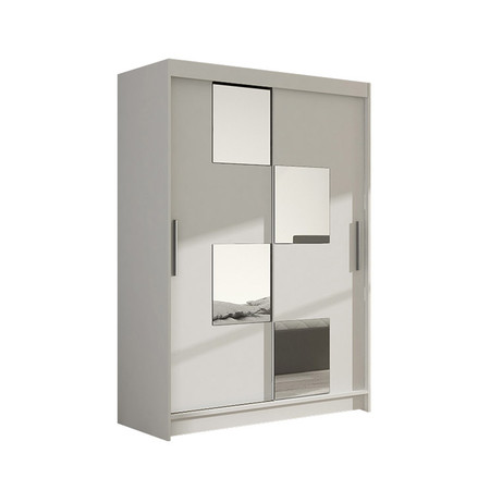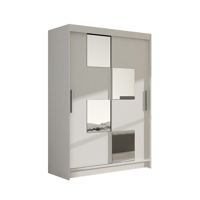 Dvoudveřová posuvná skříň. Ideální do malých místností. Originálně umístěná malá zrcátka na čelech navíc zdůrazňují zajímavý a moderní design šatní skříně. Stříbrná madla mají u tohoto modelu navíc estetickou funkci. Tyto dva dekorativní prvky dělají celek opravdu zajímavým.