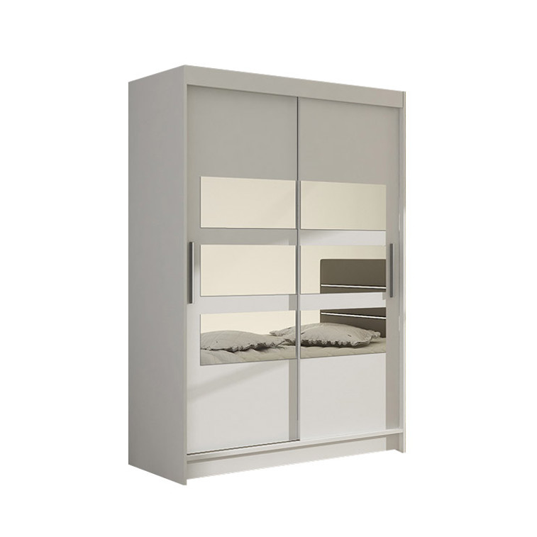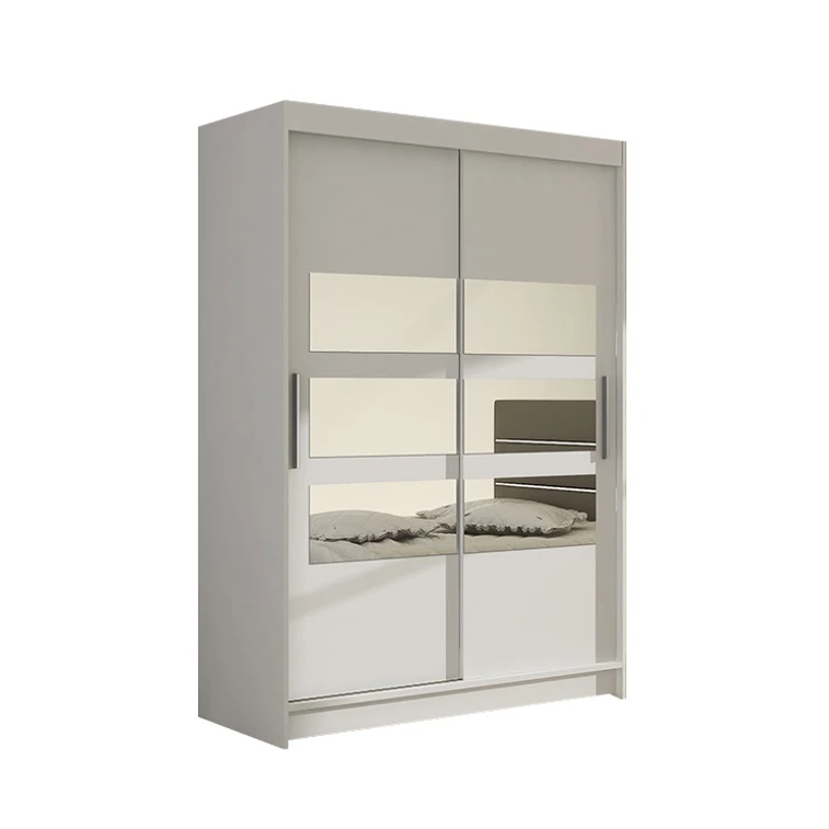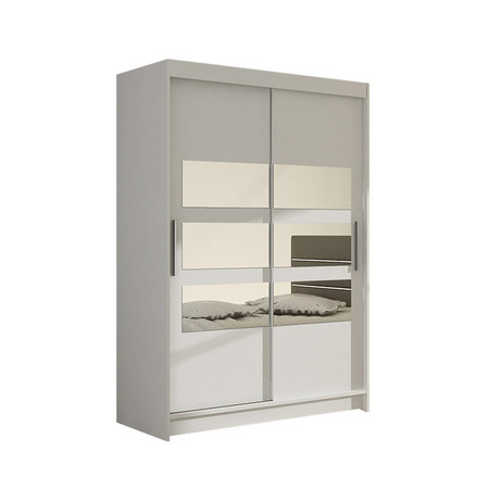 Šatní skříň s posuvnými dveřmi Miami V. Šatní skříň je extrémně odolná díky nejkvalitnějším materiálům použitým při její výrobě. Zrcadla umístěná na čelech šatní skříně jí dodávají další kouzlo a opticky zvětšují místnost. Skříň je velmi prostorná.