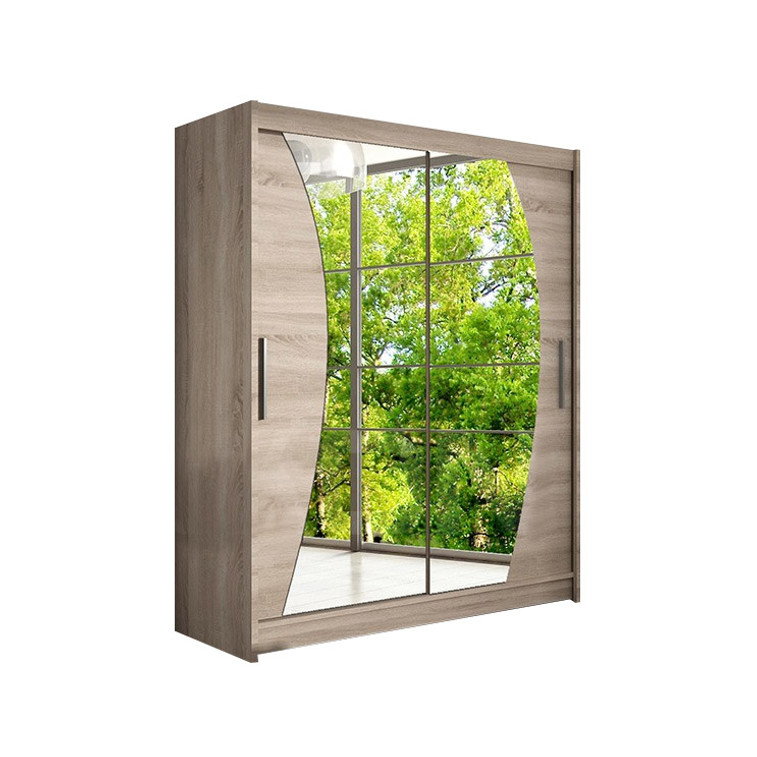 Posuvná skříň Westa X kombinuje klasickou jednoduchost a moderní design. Zrcadlo umístěné na dveřích ve tvaru oblouku dodává své jedinečné kouzlo. Je ideální jako šatní skříň do předsíně nebo místo pro uložení oblečení v ložnici nebo jiných drobností každodenní potřeby. Střed šatní skříně je rozdělen na dvě stejné části. Na pravé straně jsou police a na levé straně závěsná šatní tyč.