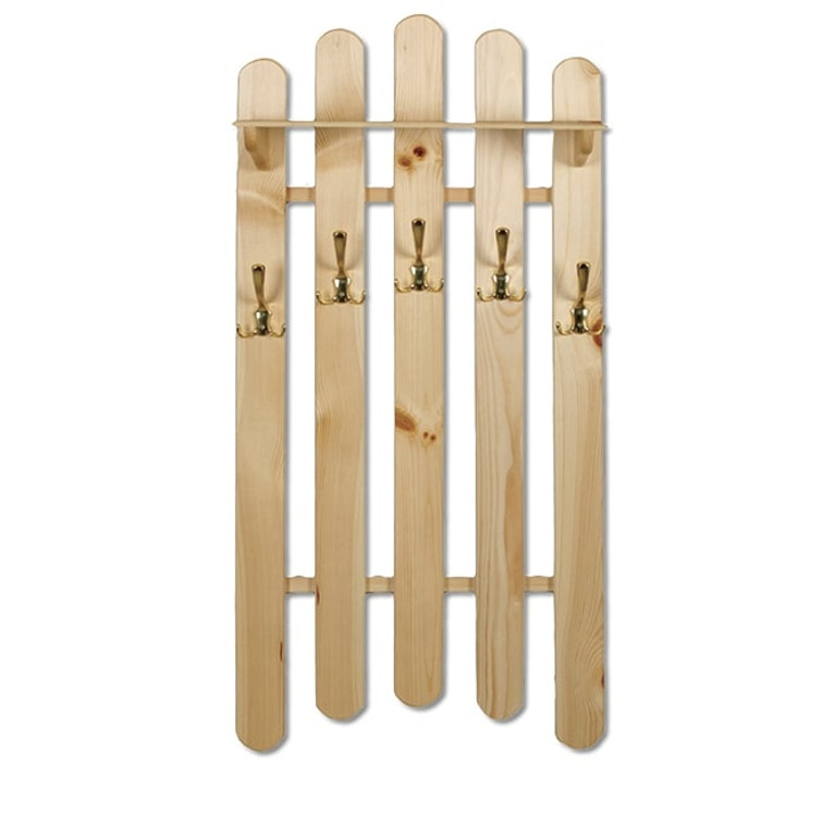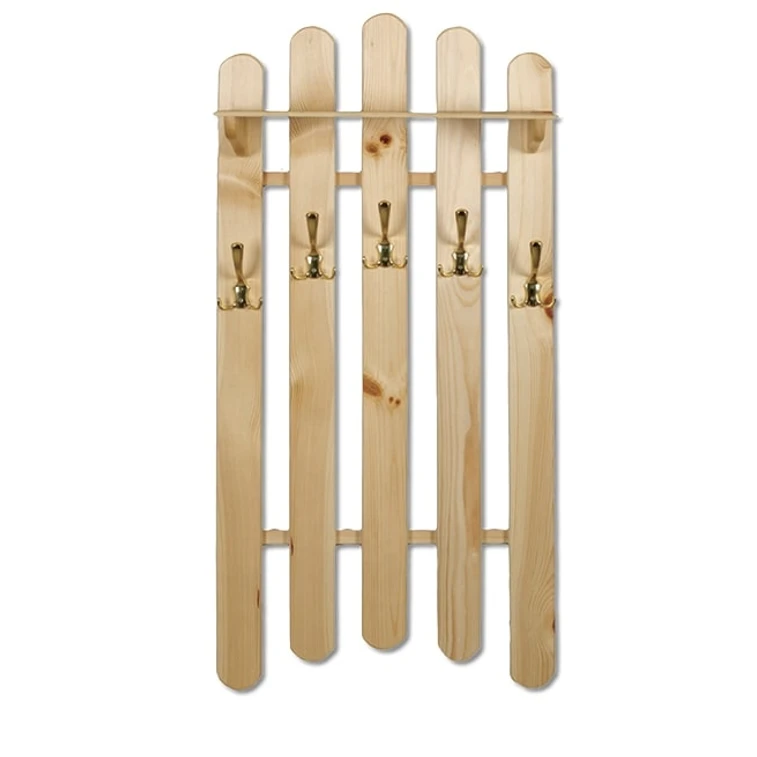 Věšák WS103 s háčky je praktickým a zároveň pěkným doplňkem každé předsíně nebo chodby. Tato stěna je vyrobena z přírodní masivní borovice a obsahuje řadu kovových trojháčků, které jsou využitelné pro zavěšení různého oblečení. Tento výrobek se vyznačuje pečlivým zpracováním a dlouhou životností.