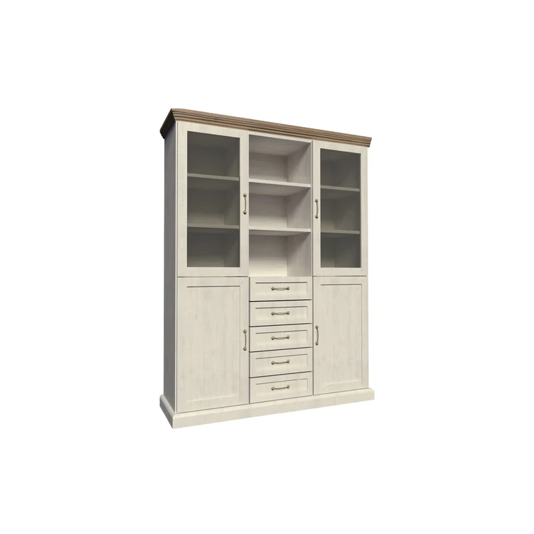 Kvalitní a moderní vitrína ROYAL W2D. Jedinečný design je sklouben s vysokou funkčností, takže se nemusíte bát, že váš nový nábytek bude pouze na ozdobu. Každá skříňka nabízí dostatek úložného prostoru, kam umístíte všechny potřebné věci. Originální kovové úchytky dokreslují venkovský charakter nábytku.